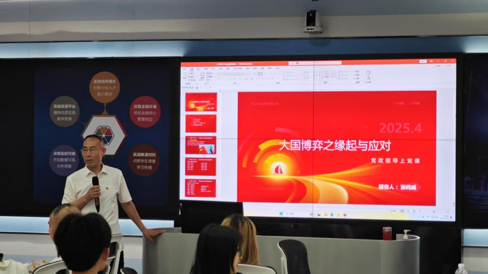 为深入贯彻新发展理念,持续推进国家创新体系建设,强化战略科技力量,加速创新型国家建设进程,厚植广大青年爱党爱国爱社会主义的深厚情怀,坚定青年社会主义信念,数字金融学院立足专业特色与学科优势,于2025年4月22日在厚德楼C301教室举办主题为“大国博弈之缘起与应对”的数字金融学院思政第一课。本次课程由数字金融学院院长张纯威教授担任主讲,为师生们带来了一场思想与知识交融的盛宴。