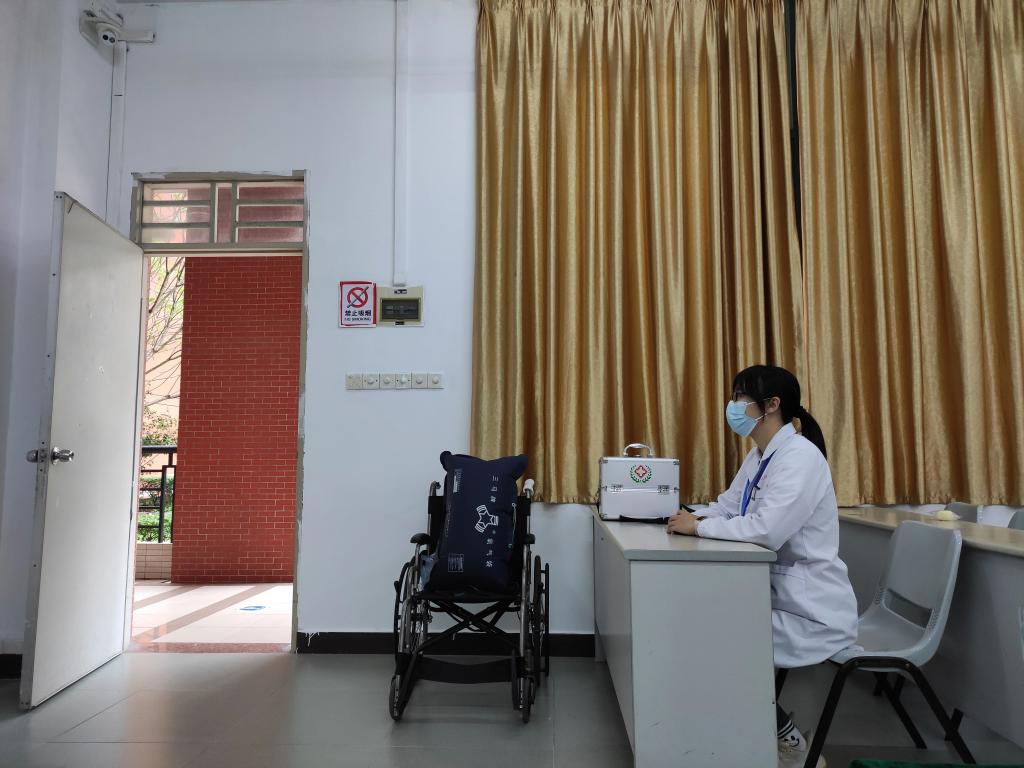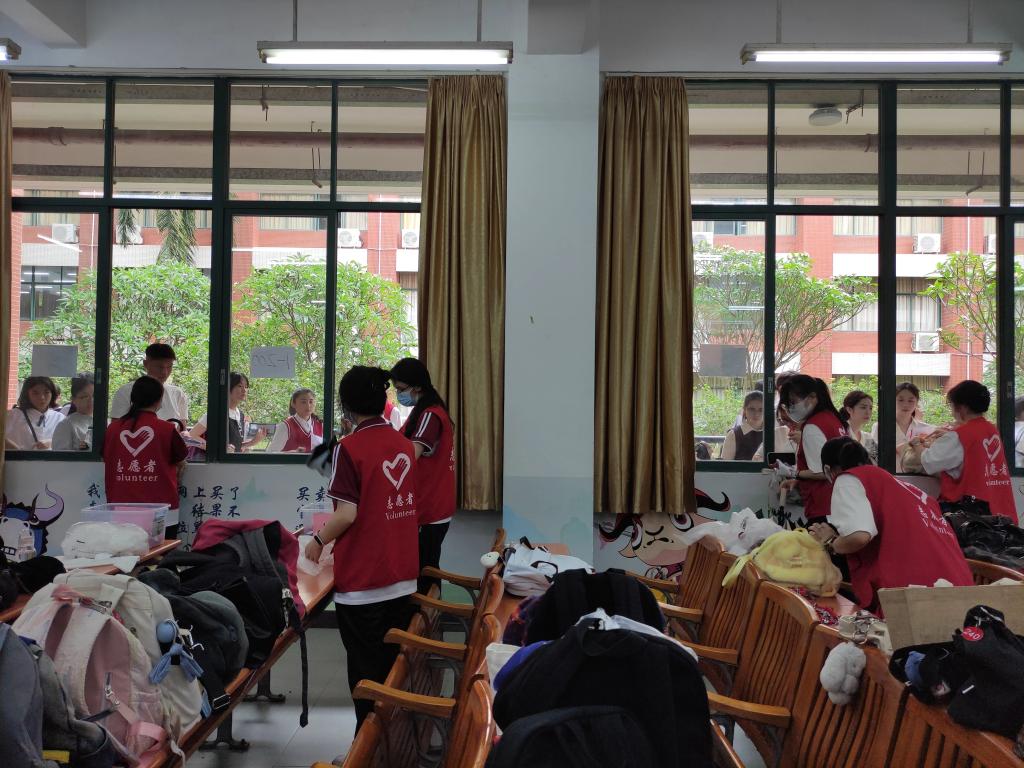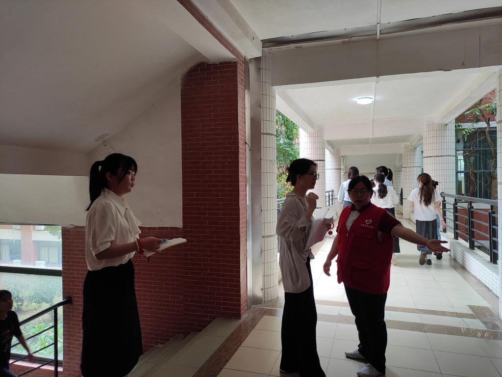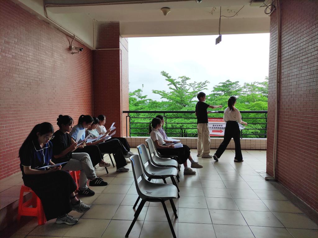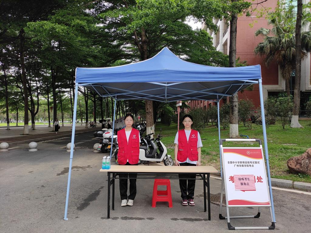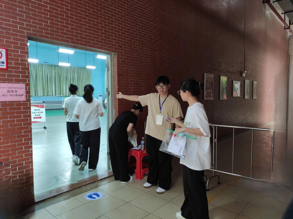 考场内,我考点设置指引标识、展架海报、纸巾用水及特殊考生服务点;安排工作人员、志愿者积极答疑,引导考生快速入场候考;配备专职医护人员,准备常用药品、轮椅等,全程为考生提供医疗保障服务;受雨天影响,考场入口提前搭好遮雨棚,考务室为面试官和考生准备吹干衣物的风筒;考场外,交警部门全力保障考点交通秩序,为考生保驾护航。