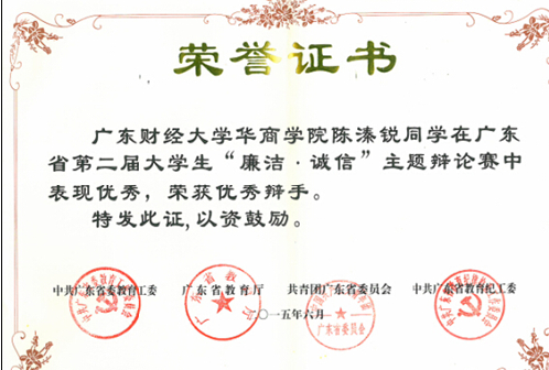 近日,在由中共广东省委教育工委、广东省教育厅、共青团广东省委员会、中共广东省教育纪工委联合主办的广东省第二届大学生“廉洁.诚信”主题辩论赛中,我院陈溱锐同学荣获“优秀辩手”称号。