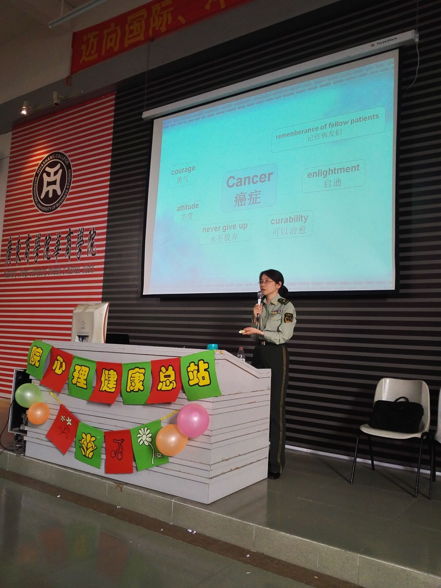 鉴于春夏之交是心理障碍多发期,为了减少心理问题发生的几率,提高学生心理自我保健能力,我院于2016年4月5日下午邀请武警广东总队医院心理科主任唐记华医师,在励志楼C408教室面向全院学生开展了我院本年度第一场题为“塑造阳光心态,享受完美人生”的心理健康讲座。讲座由学生处副处长熊桂桃主持。