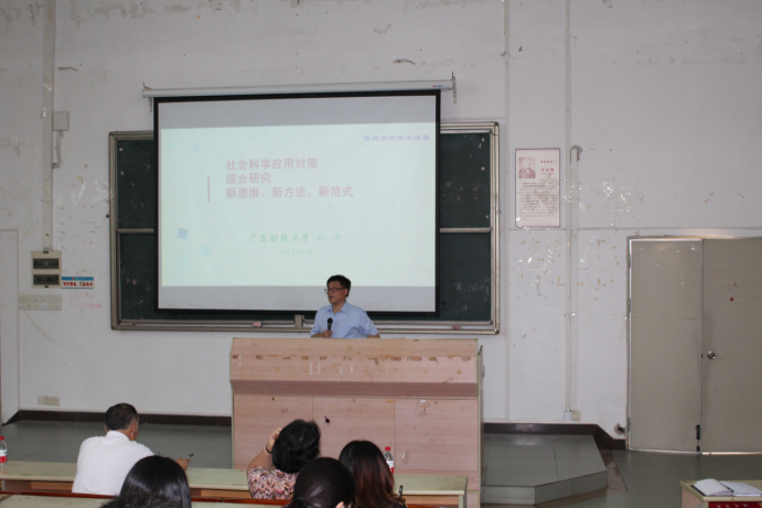 5月9日下午,应我院人事处、科研处的邀请,广东财经大学经济学院院长、国民经济研究中心主任林洪教授于励志楼B307室为我院青年教师做了《社会科学应用对策综合研究新思维、新方法、新范式》的学术报告。支戈壁副院长、张捷副院长、科研处张成诗处长及各教学单位青年教师180余人聆听了这次报告,报告由副院长张捷教授主持。