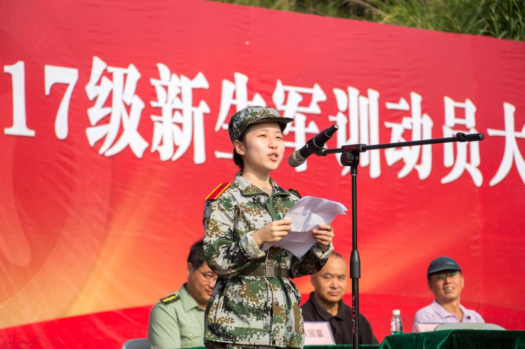 来自文学院外语系的参训学生代表郑晓薇同学上台发言。她认为,军训是展现新生们精神面貌的绝佳机会,也是一个能让人的身心得到磨练的过程。她希望新生们在军训中做到严格要求自己,同时在军训中展示自己的青春风采。