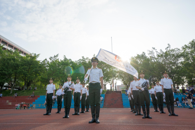 随着国歌声的响起,学院全体师生注视着五星红旗冉冉升起。本次2017级新生军训大会也正式开始。随后,郭银华副院长向军训团郑宏兴团长授予军训团团旗。