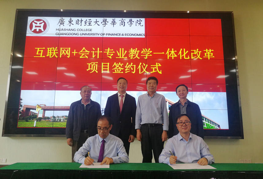 随后,广东财经大学华商学院代表郭银华教授与正保远程教育公司代表刘温泉副总裁就互联网+会计专业教学一体化改革项目正式进行签约。