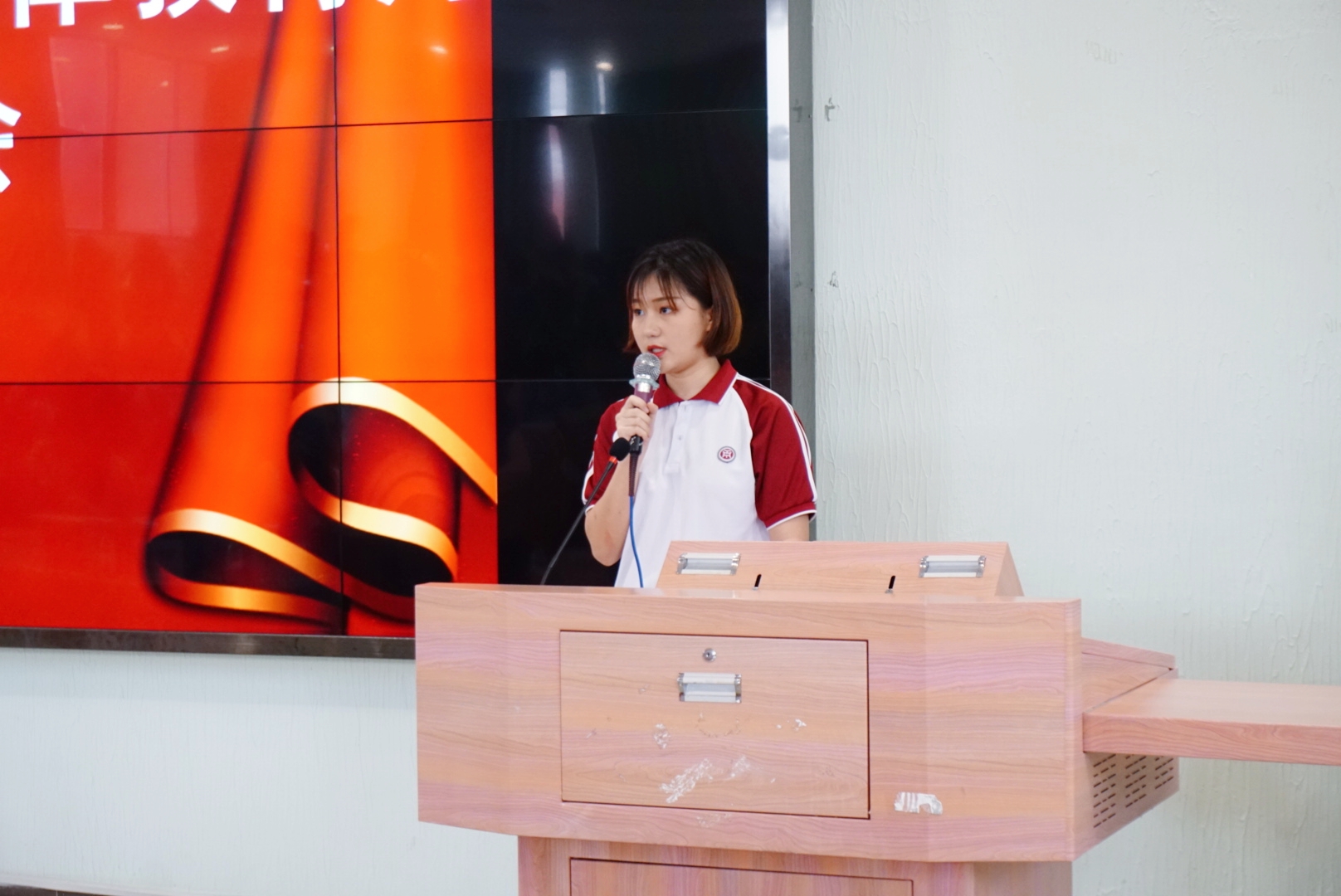 学生干部代表何沐函同学讲话。作为校学生会主席,何沐函代表全体学生干部提出“2019”工作倡议,在思想方面,要做好学生的思想引领工作,使广大同学从思想上认识到讲文明、守纪律、重安全的重要性;在行动方面,学生干部要发挥模范带头作用,以实际行动带动身边的同学们。