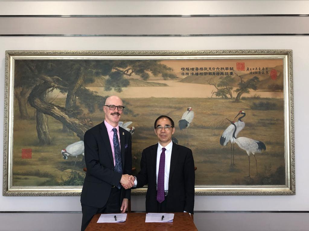 ▲OU副校长Gauld教授与威廉希尔执行校长郭银华教授签署合作协议