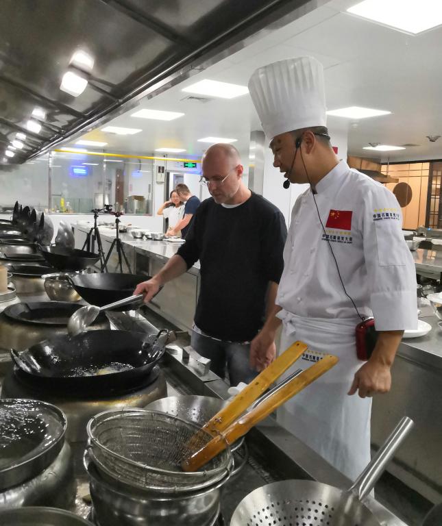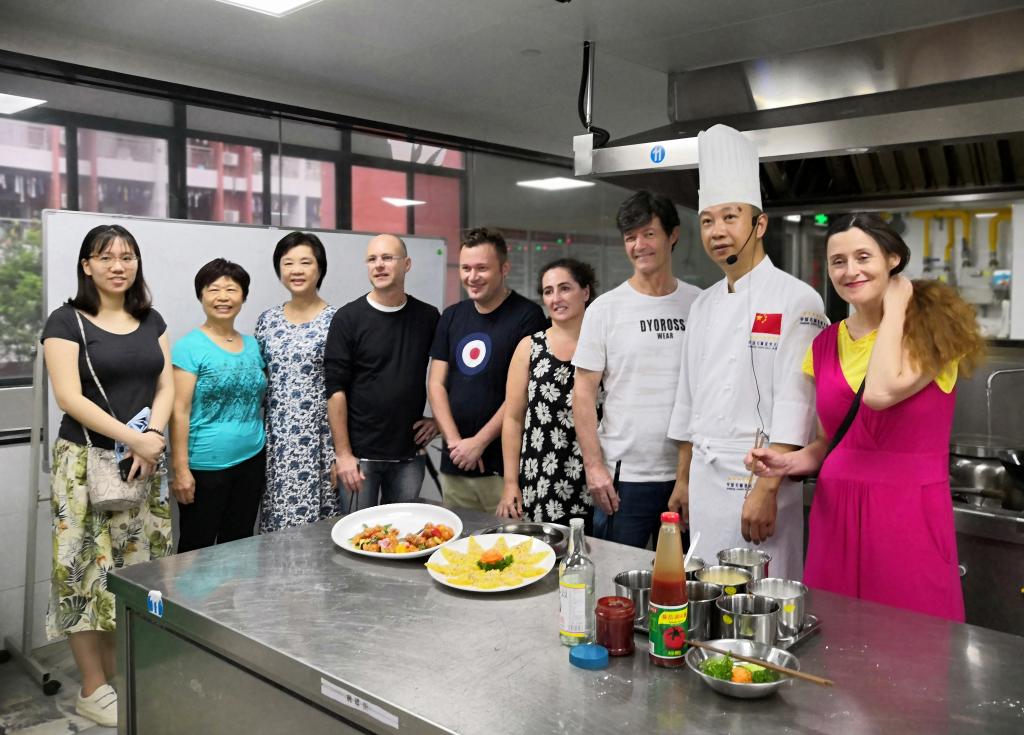 国家中式烹调高级技师、中国烹饪大师、中国金牌总厨、国侨办中餐繁荣基地(广州基地)秘书长李绪彬老师为外籍教师展示和讲解了“咕噜肉”、“醇香金瓜烙”这两道广东特色名菜、名点的做法。李老师精湛的刀工和炉火纯青的厨艺,赢得了领导们的一致肯定,外籍教师们纷纷竖起手指为李老师点赞。