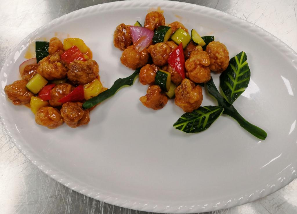 随后,在李绪彬老师的指导下,外籍教师们拿起了菜刀切肉、切菜,准备各种食材等,然后点火开锅油炸咕噜肉、炒菜、调制酱汁等。来自英国的Andrew老师第一个完成了“咕噜肉”作品,上盘后急切地品尝了他自己亲手烹饪的中国菜,在接受采访时他说了自己第一次学习中餐烹饪的感受,以及中国和英国食物的区别等。
