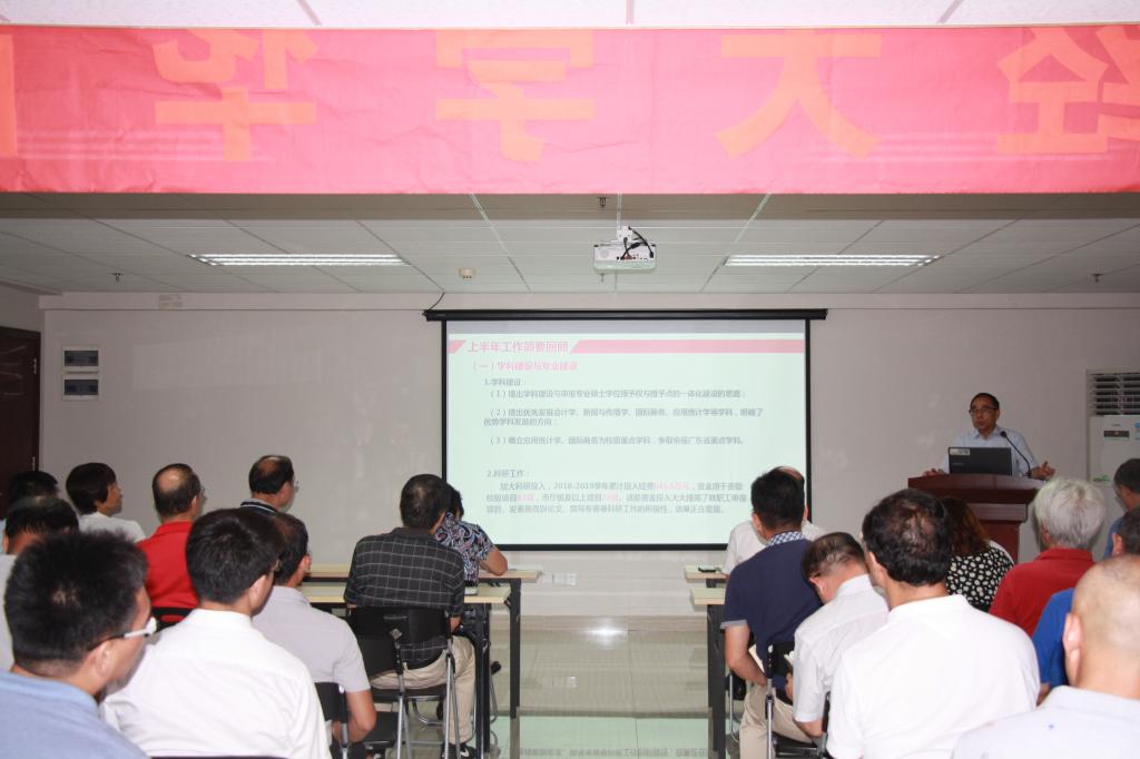 执行校长郭银华对2019年上半年学校各行政职能部门及教学单位工作情况进行了总结,肯定了学校工作取得的主要成绩,并以“加强内涵建设,提高人才培养质量”为核心,重点围绕学科建设与专业建设、师资队伍建设、教学条件与资源建设、教学研究与教学改革、对外交流合作与国际教育和创业教育、学生管理、招生就业、行政与继续教育及制度建设等九大方面进行了回顾。郭银华强调,新学期要大力推进学校宣传建设、校友建设、实验室建设及校企合作工作,进一步做好新学年新学期的各项安排,圆满完成2019年制定的各项工作任务。