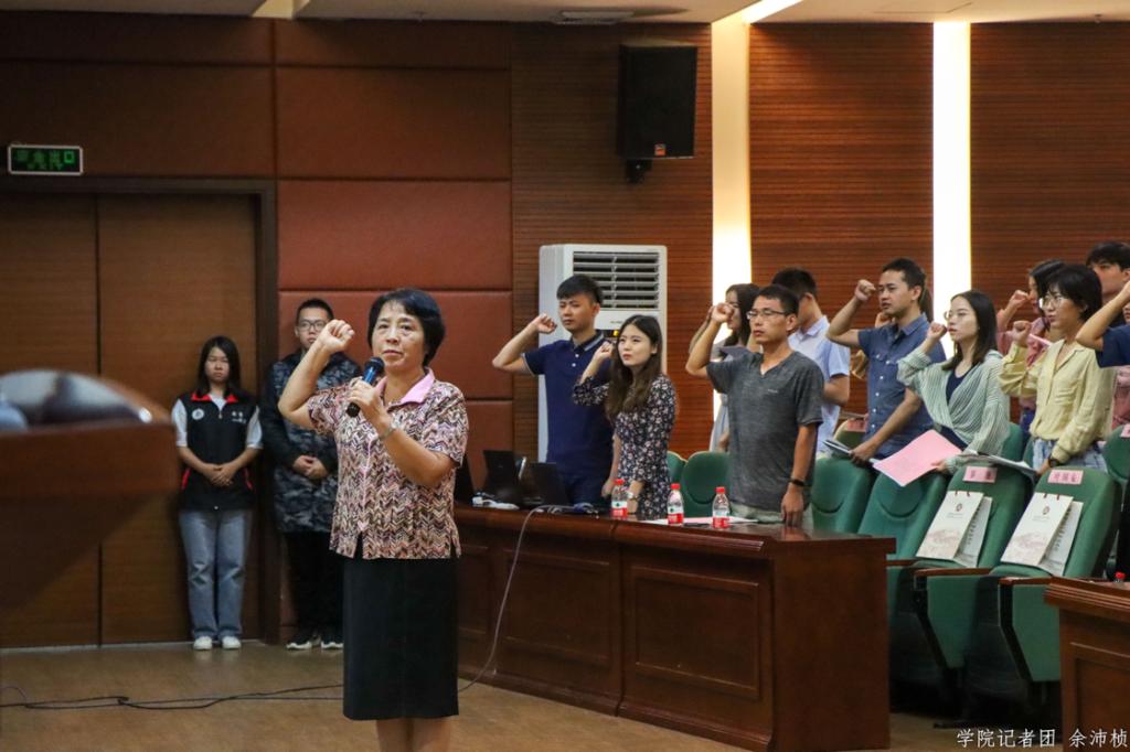 伴着激昂的国歌,典礼拉开了序幕,郭银华校长作本次大会的开场发言。郭校长对新教职工表示了热烈的欢迎和衷心的祝贺,并强调新教职工们要牢记“为党育人,为国育材”的初心,坚持以教学为中心的工作导向。郭校长指出,培育社会主义建设者和接班人是教育的根本任务,是教育现代化发展的方向和目标。郭校长对新教职工提出了以下三点希望:一是牢记为党育人、为国育才的初心,不忘教书育人使命;二是坚持育人为本,育德为先的理念;三是牢固树立热爱教育,淡泊名利的信念。