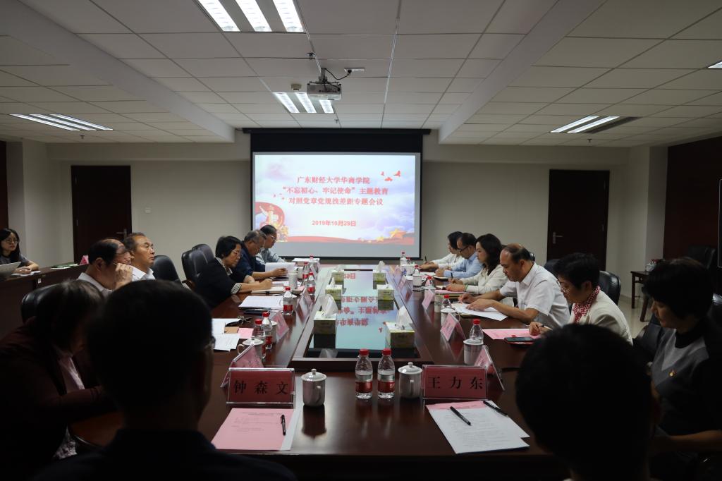 为进一步把党章党规学深悟透,加强党员干部的理论基础建设,按照“不忘初心、牢记使命”主题教育部署安排,10月29日,威廉希尔召开领导班子对照党章党规找差距专题会议。省委教育工委第四指导组成员到会监督指导,广东财经大学华商学院“不忘初心、牢记使命”主题教育领导小组全体成员、全体校领导班子出席了本次会议,并对照党章党规查找自身差距,明确整改方向和措施。