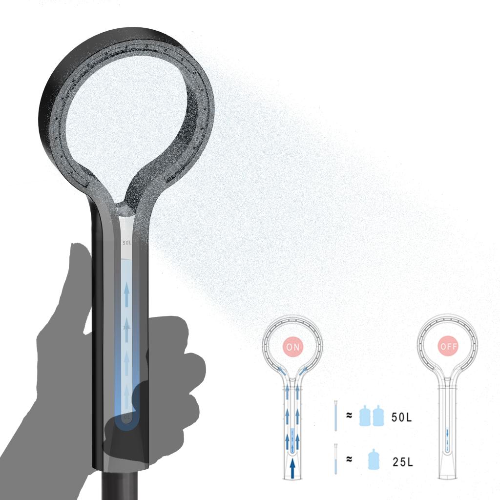 洗澡基本上是每个人每天都要做的一件事,人们在淋浴方面所造成的水资源流失是巨大的。我希望在花洒中部加入一个储水槽实时反馈你当前的耗水量。当水位不断上升,蓝色渐变条渐渐消失,是在告诉我们水资源正在慢慢流失。当人们每次洗澡都看到原来自己洗澡的时候浪费了如此多的水是不是也会适当的减少洗澡时间呢。