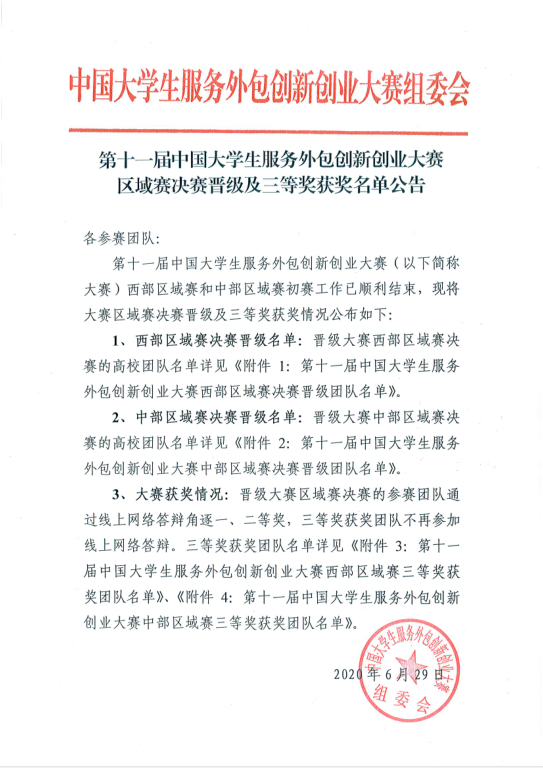 近日,第十一届中国大学生服务外包创新创业大赛组委会公布初赛成绩。本届大赛共吸引了来自全国651所院校的6417支团队报名,在威廉希尔师生的共同努力下,“快乐就完事”和“今晚不熬夜1”团队晋级中部区域赛决赛,角逐一、二等奖,“超级云课堂”团队获得中部区域赛三等奖。