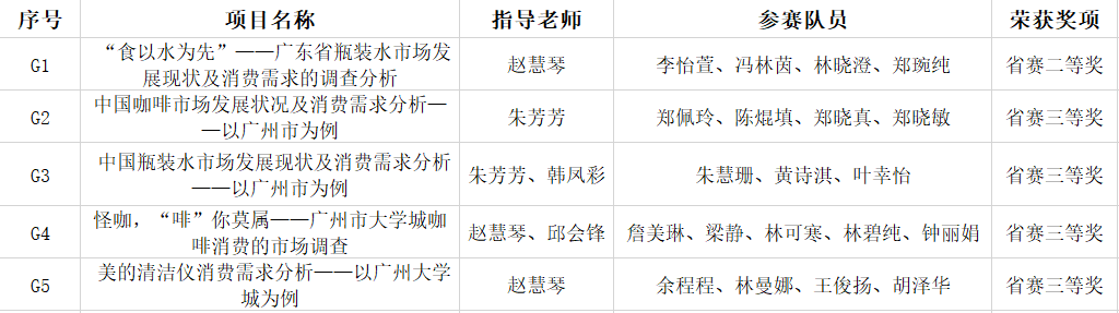 其中由赵慧琴老师指导的“食以水为先”——广东省瓶装水市场发展现状及消费需求的调查分析(李怡萱组)荣获本科组省赛二等奖;朱芳芳老师指导的“中国咖啡市场发展状况及消费需求分析——以广州市为例”(郑佩玲组)荣获本科组省赛三等奖;朱芳芳老师、韩凤彩老师指导的“中国瓶装水市场发展现状及消费需求分析——以广州市为例”(朱慧珊组)荣获本科组省赛三等奖;赵慧琴老师、邱会锋老师指导的“怪咖,“啡”你莫属——广州市大学城咖啡消费的市场调查”(詹美琳组)荣获本科组省赛三等奖;赵慧琴老师指导的“美的清洁仪消费需求分析——以广州大学城为例”(余程程组)荣获本科组省赛三等奖。