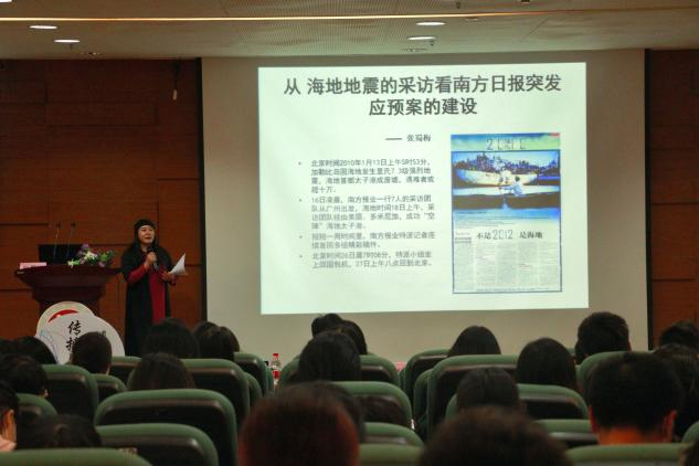本次讲座的嘉宾张蜀梅老师是一位拥有丰富实践经验的记者,也是一位出版众多书籍的作家。曾经参与过多次诸如汶川地震、SARS病毒等突发事件的新闻报道。早在一年前,张蜀梅老师就为我院师生讲述过汶川报道中的生死时刻,现场座无虚席。时隔一年,传院师生热情不减,又一次等来了张蜀梅老师关于海地地震报道的经验分享。