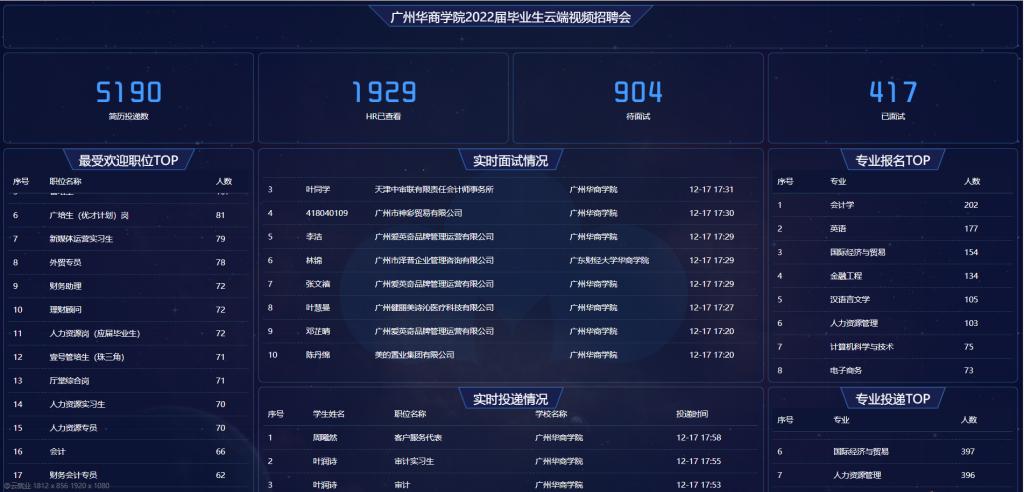 最后,云端招聘求职者人数达1820人,投出简历数共计5190人次;平台浏览量达44141人次;视频总面试次数达601次,面试合适达378人,待面试904人;企业主动发出2309次面试邀约,平均面试时长达9分34秒;会后共1109人与用人单位达成初步就业意向,37人即刻云端录用。