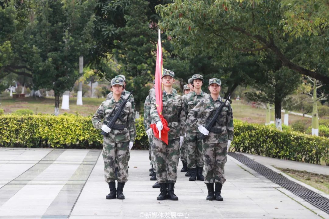 在场师生庄严肃穆,国旗护卫队队员迈着矫健铿锵的步伐,护卫五星红旗向图书馆广场国旗台走来。