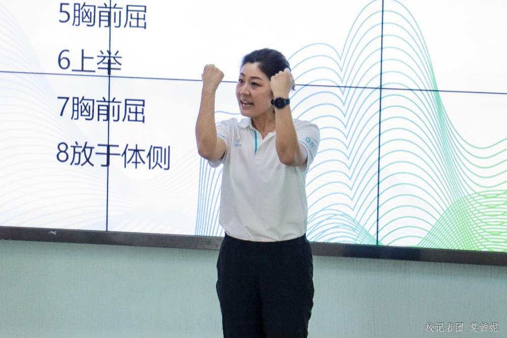 朱宁宁老师以寓教于乐的教学方式,带来了以“第三套全国健美操大众锻炼标准一级套路组合Ⅰ”的主题授课。通过示范教学法、言传身教并行的方式,围绕健美操的第一组八拍动作做了生动而详细的讲解和示范,且在教学过程中不断加以鼓励,使学生感受到运动的愉悦感和成就感,实现了课堂与学生的同频互“动”。