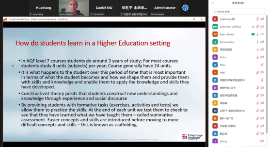 Peter Vitartas先生以传统线下教学模式和线上教学模式作对比为切入点阐释了如何设计高校线上课程内容,给通过网络学习的学生提供更好的学习环境和学习体验,提升他们的学习效率。Peter强调老师们首先需要深入掌握教学内容和学生学习的偏好、习惯等,从而有针对性地为他们提供相应指引、指导和帮助。他建议线上课程设计多思考与学生互动方式、多利用多媒体设备和网络资源以及多反思教学方法,教师应为学生提供更多的练习机会巩固知识,并设有评价标准检验学生学习成果。