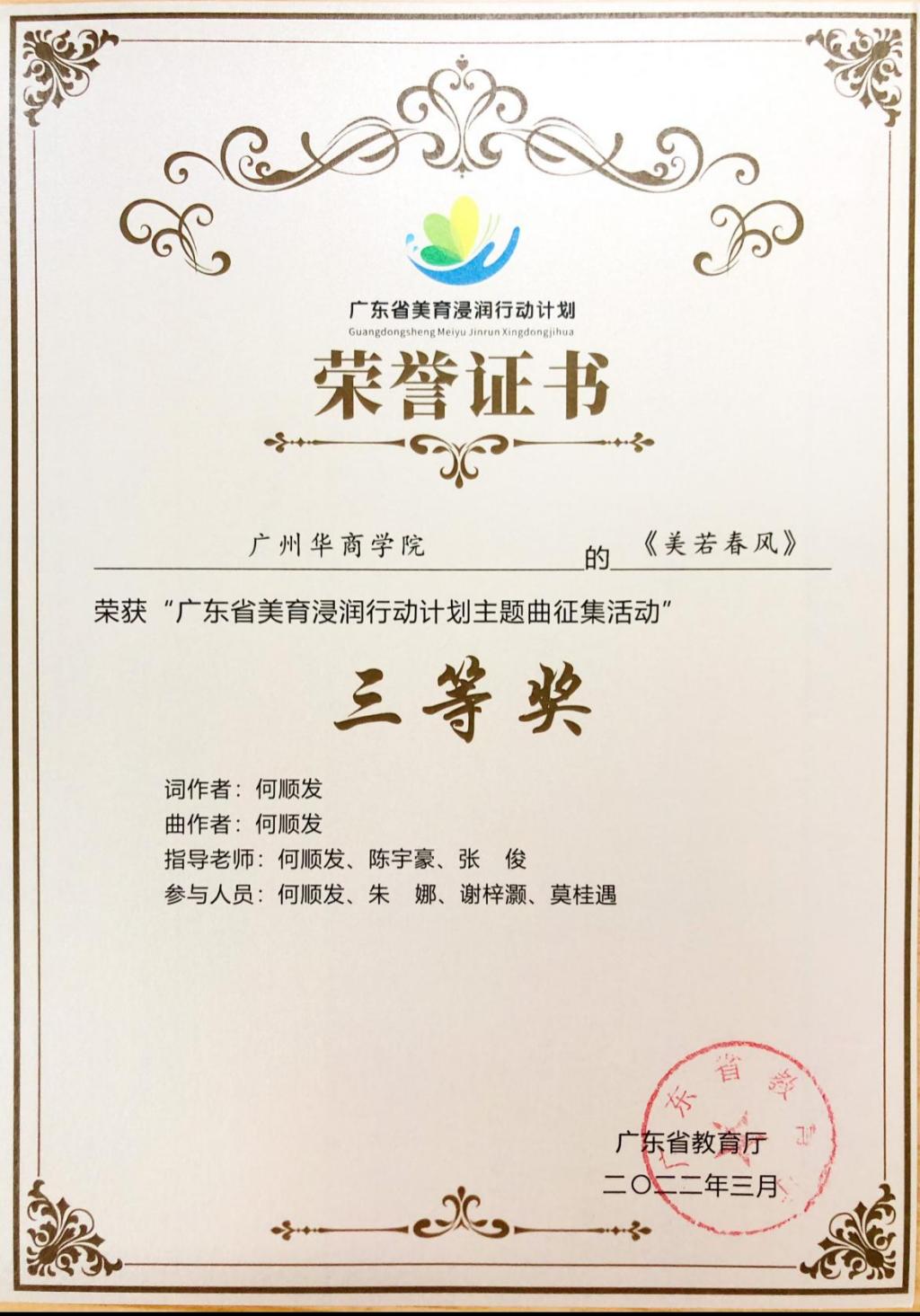 近日威廉希尔工会传来喜讯,外国语学院教职工何顺发等多位老师凭借作品《美若春风》荣获“广东省美育浸润行动计划主题曲征集活动”三等奖。