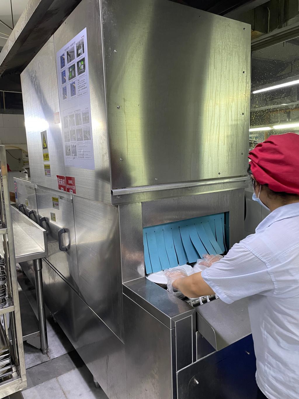 在餐具洗消间,检查组看到洗碗机正在工作中,数名工作人员依次把已过2次冲洗的餐具放进洗碗机再次清洗消毒。旁边放置几个大型消毒柜,存放着已经消毒的成品盘。检查组看到这些清洗消毒过程,表示放心。