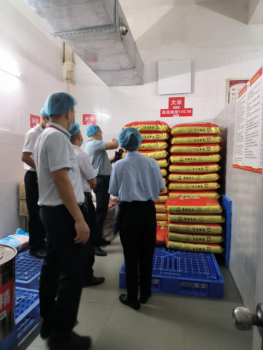 在仓库,检查组看到大米、调和油、酱油、面粉等摆放整齐,并且详细查看了米、油、肉类的进货票据、相关检测报告、供货商的营业执照、食品经营许可证等资料符合要求,表示满意。检查组还询问了近期员工的培训情况、“四害”消杀的频次,以及日常监管情况。最后检查组指示学校在做好食品安全的基础上,要加大节约粮食的宣传教育工作。