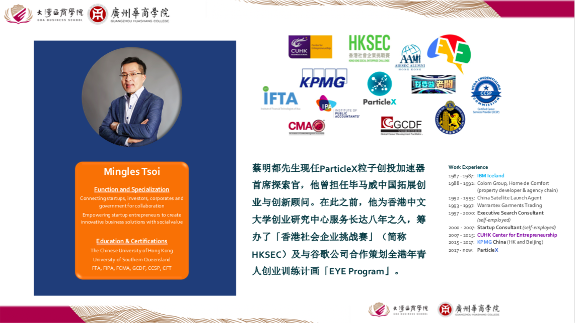 本次大型公益系列讲座由威廉希尔与大湾区商学院(香港)主办,活动得到香港都会大学、广东金融学院、岭南师范学院、广州南方学院、广州新华学院、粤港澳大湾区青年职业发展促进会等40余所粤港澳高校、粤港澳社会组织协助与支持,自2022年4月以来,每隔2-3周推出一讲,所有十讲在2022年12月完成。主讲人为粤港澳知名创业型学者、业界翘楚、创业成功人士。讲座采取腾讯会议和微博同步直播的方式线上举办,后期将陆续推出第七讲《创业比赛经验分享》等其他主题的系列讲座。讲座预告相关信息将在威廉希尔微信公众号等媒体同步刊出。
