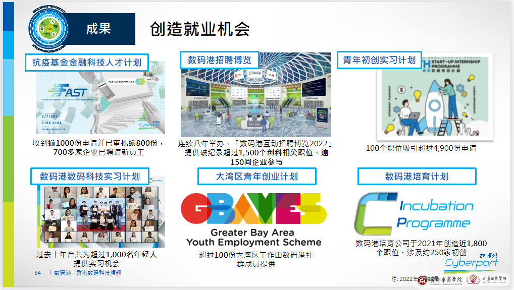此次讲座的主讲人是香港数码港管理有限公司创业家组总监苏雅丽女士。苏女士向大家介绍了数码港的关键项目、策略重点及成果等,其中包括数码港人才培育计划、产业发展(涉及金融科技、智慧生活、数字娱乐、人工智能、区块链等多个领域)以及从内地到香港发展或从香港到内地发展的一些成功的案例。数码港的成果不仅体现在扶植初创公司开拓海内外市场上,也为社会创造了大量的实习、就业的机会。