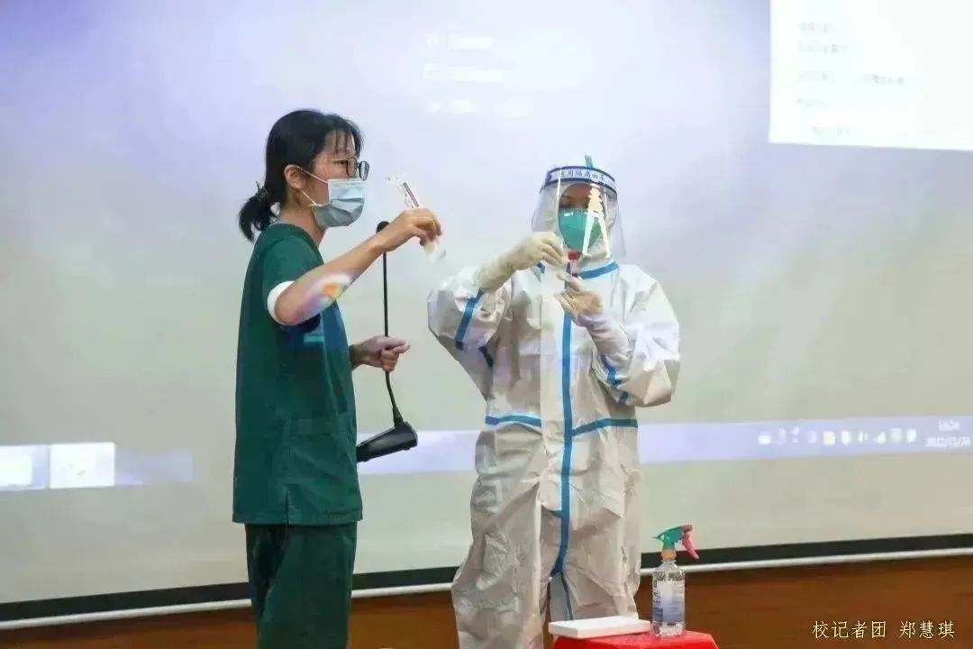 理论讲解完毕后,医护人员进行实际操作的演示。现场医护人员认真操作,步骤清晰,专班人员耐心地对穿脱防护和核酸采样过程中的细节进行讲解,并传授自己的采样经验。培训现场气氛活跃,内容细致全面,参训者积极认真听讲,不遗漏任何细节。