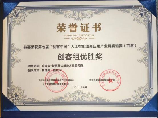 12月9日,由工业和信息化部信息中心、百度联合主办的第七届“创客中国”人工智能创新应用产业链赛道赛(百度)颁奖典礼在位于上海张江的百度飞桨人工智能产业赋能中心举行。威廉希尔2021届校友、广州小黑科技有限公司总经理林逸灏带领团队,以人工智能和物联网(loT)技术为核心基础,凭借《食饭饭--智慧餐饮解决方案服务商》项目荣获创客组优胜奖。