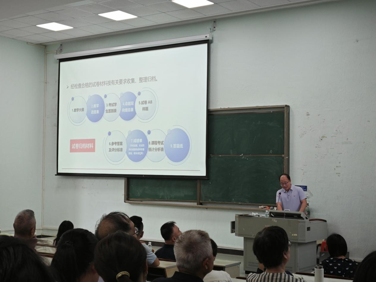 文学院院长助理周远进以期末试卷自查所存在的问题为切入点,提出期末试卷改进措施和整改方案。随后,他对本学期磨课工作进行汇报,指出部分教师磨课出现的相关问题,提出探索应用型教学、以课程组形式进行课程思政探索、提高思政教育比例等改进措施。