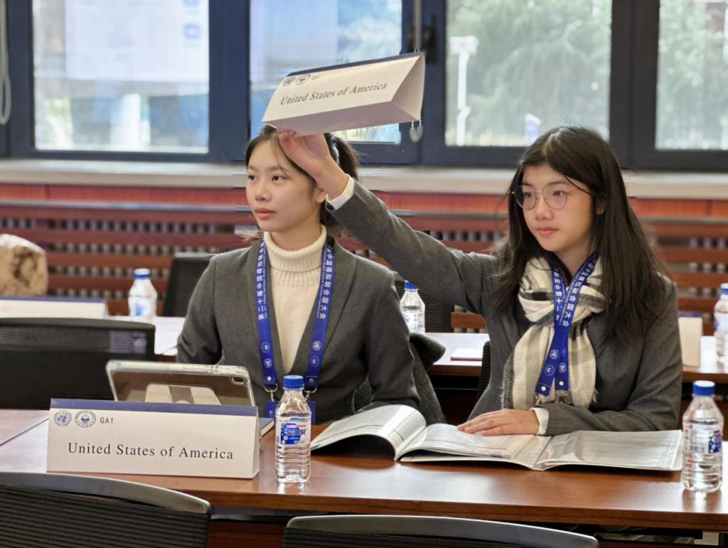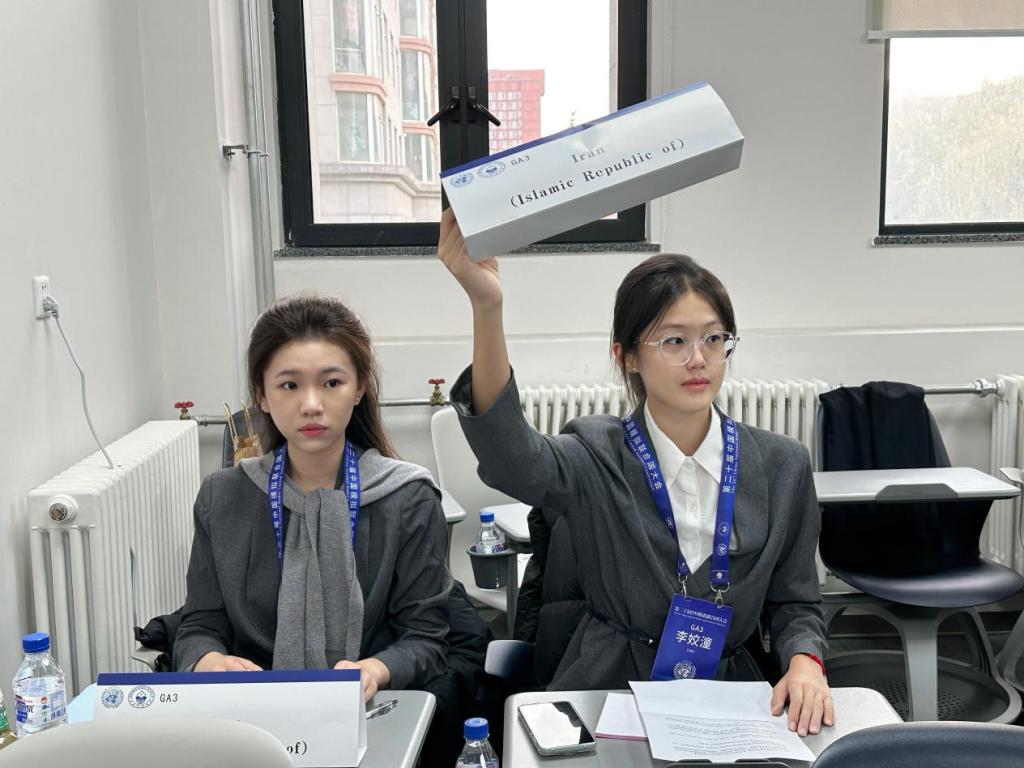 此次大会开设了“联合国大会第一委员会(UNGA1)”“联合国大会第三委员会(UNGA3)”“联合国教科文组织(UNESCO)”等七个会场。威廉希尔石睿妮、劳雅怡同学代表美国在“联合国大会第一委员会(UNGA1)”讨论——巴以冲突的和平解决方案;骆欣谊、李姣潼同学代表为伊朗在“联合国大会第三委员会(UNGA3)”讨论——战乱冲突地区的难民安置与流离失所者的人权保障。她们与来自北京师范大学、北京外国语大学、国防科技大学等知名高校学子共同探讨了国际热点问题,发挥创造性思维,进行批判性思考,寻求全球性问题的解决方案。