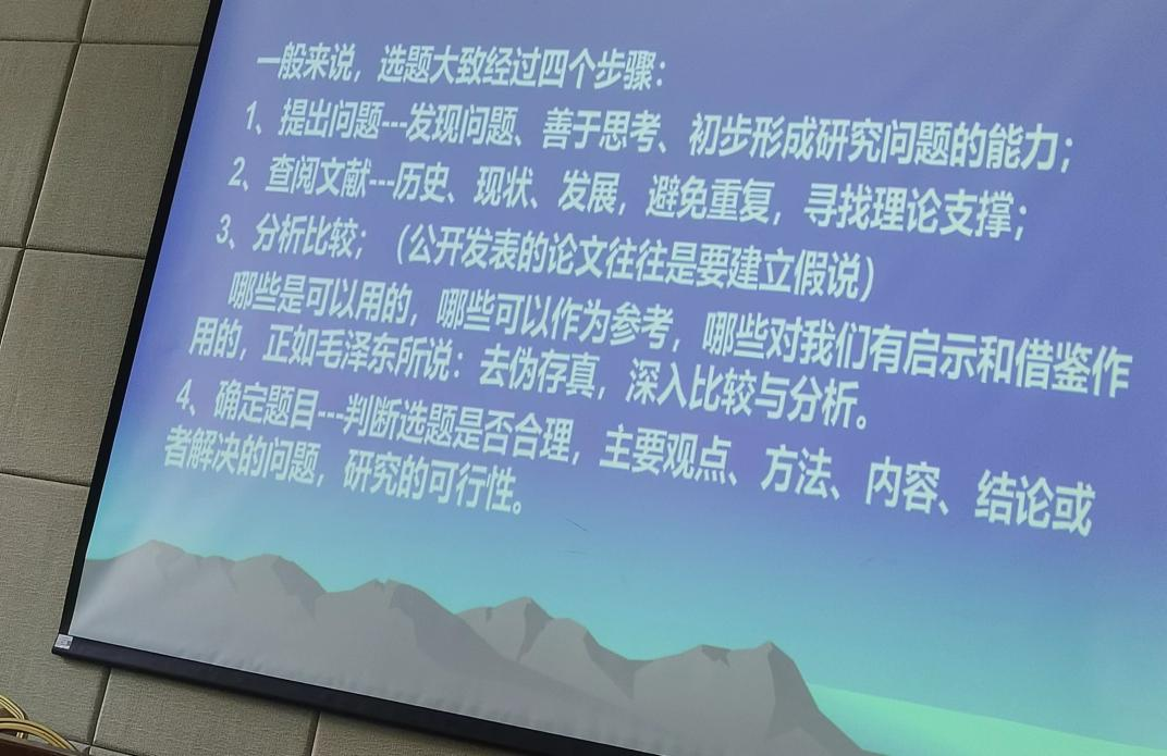 对选题的过程,董教授指出,选题大致经过四个步骤:第一,提出问题——发现问题、善于思考、初步形成研究问题的能力;第二,查阅文献——历史、现状、发展,避免重复,寻找理论支撑;第三,分析比较——公开发表的论文往往是要建立假说:哪些是可以用的,哪些可以作为参考,哪些对我们有启示和借鉴作用的;第四,确定题目——判断选题是否合理,主要观点、方法、内容、结论或者解决的问题、研究的可行性。