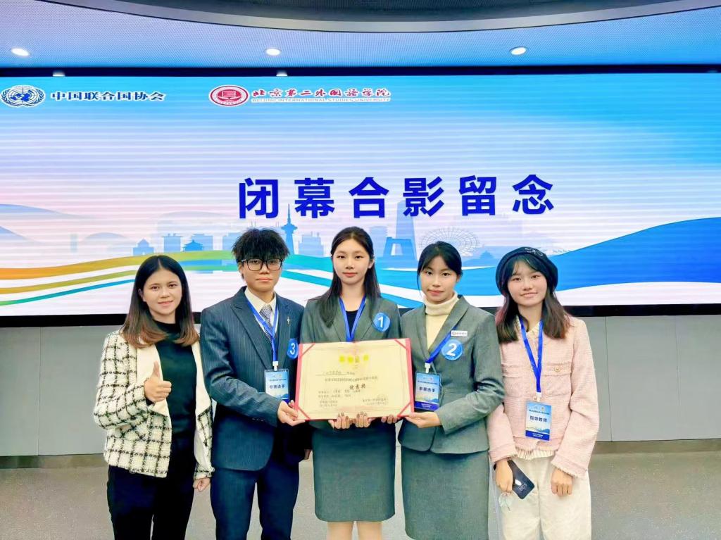 本届竞赛由中国联合国协会、北京第二外国语学院主办,面向全国高校,比赛需要通过线上学术测试后,胜出的高校队伍才可进入现场比赛。经过努力,由国际学院2023级石睿妮、余意和人工智能学院2021级张德杨3名同学组成的联队,通过激烈而紧张的学术测试、现场初赛后顺利进入决赛。