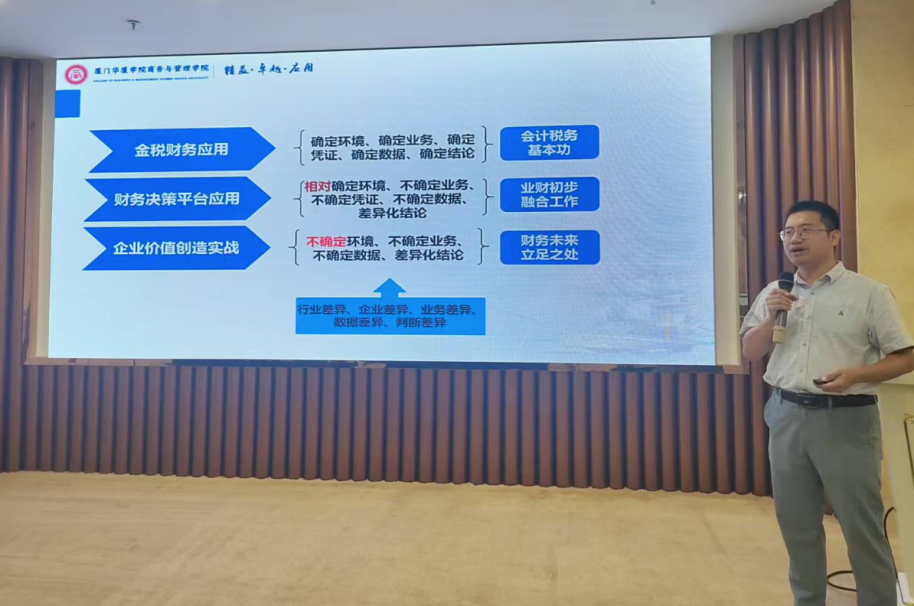 厦门华厦学院商务与威廉希尔副院长郭文茂副教授进行“以企业价值创造为核心的财会类实践教学体系构建”主题分享。他围绕“金专、金课、金师、金地、金教材”五个方面,深入阐述了“五金”建设发展体系,以数字化教学仿真资源平台为例,探讨全方位财会数字化教育资源开发模式,进而为企业价值创造提供发展方向。