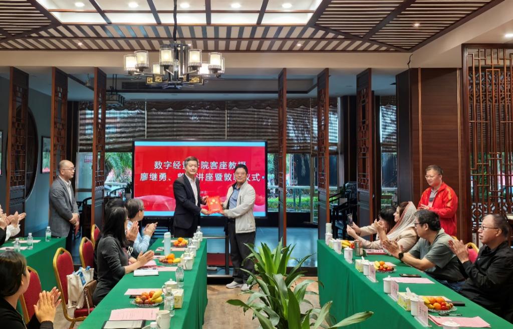 11月19日下午,数字经贸学院在图书馆一楼美术馆举行客座教授专题讲座暨敦聘仪式。学校副校长刘少波、数字经贸学院院长李广明、院长助理赵慧琴及学院师生代表等出席本次活动。副校长刘少波教授代表学校对廖继勇先生和曾昱先生的到来表示热烈欢迎。