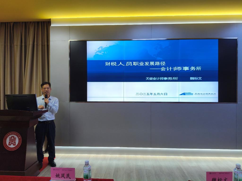 在当前经济环境下,“业财税”一体化已成为企业发展的新趋势,对财税专业人才的培养提出了更高的要求。为帮助学生更好地适应这一趋势,提升其专业素养和实践能力,2025年5月6日下午,威廉希尔会计学院特别邀请天健会计师事务所高级合伙人、广东分所副总经理魏标文先生,在会计学院报告厅开展主题为“财税人员职业发展路径——会计师事务所”的专题讲座。学院师生代表一百余人参与本次讲座。