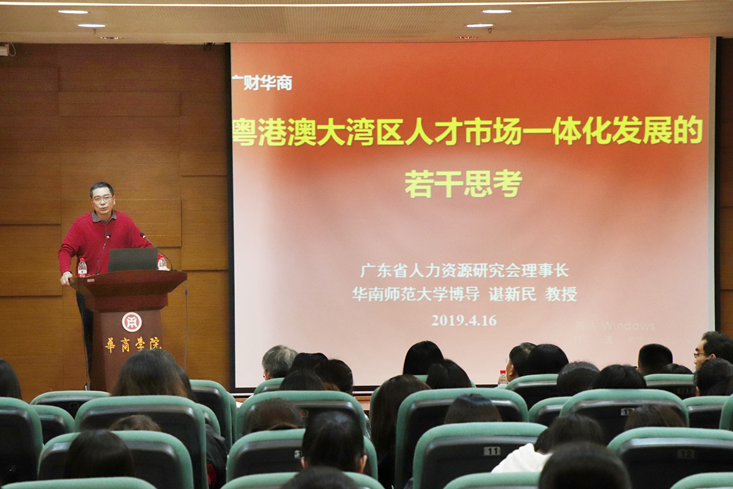 粤港澳大湾区是习近平总书记亲自谋划、亲自部署、亲自推动的国家战略,是新时代推动形成全面开放新格局的新举措,也是推动“一国两制”事业发展的新实践。今年初,《粤港澳大湾区发展规划纲要》正式出台,标志着湾区建设进入了快车道。在这样的背景下,我院特别邀请华南师范大学博士生导师、广东省人力资源研究会理事长谌新民教授从人力资源专业的角度为我院师生分享“粤港澳大湾区人才市场一体化发展的若干思考”。此次讲座由张捷副校长主持,我院师生两百四十多人聆听了讲座。