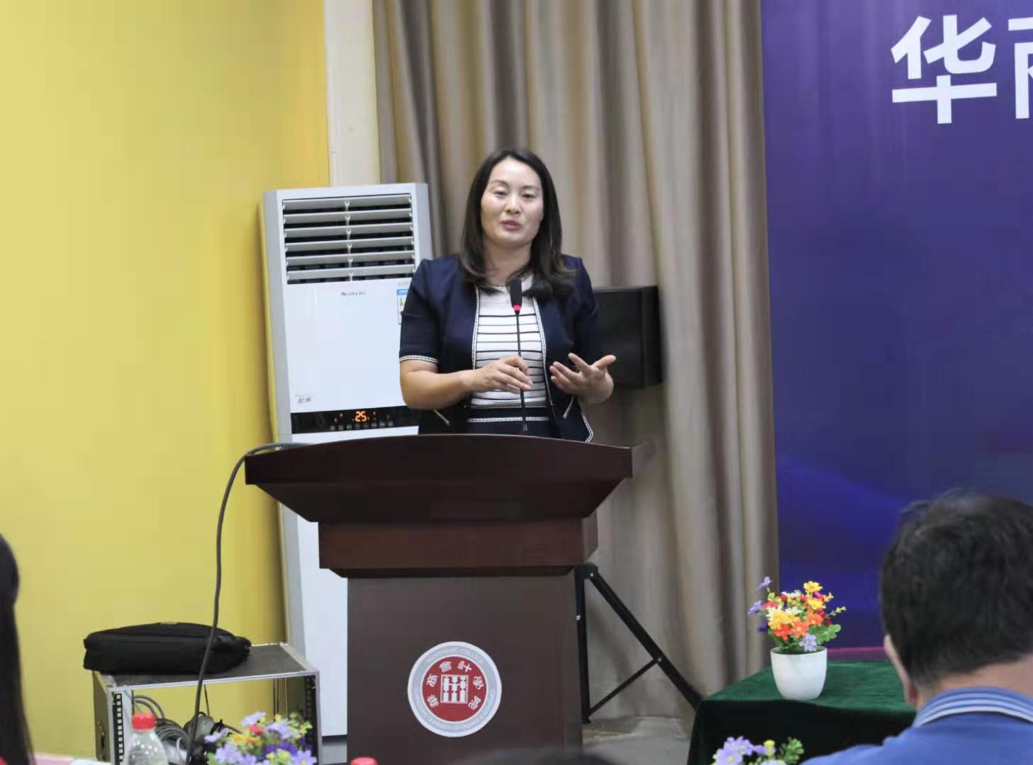 正誉企业管理(广东)集团股份有限公司、广州融智共创科技有限公司董事长鲁银花女士致辞,她指出,会计教育改革势在必行,要将企业环境带到学校,加强企业需求和会计发展的联系。