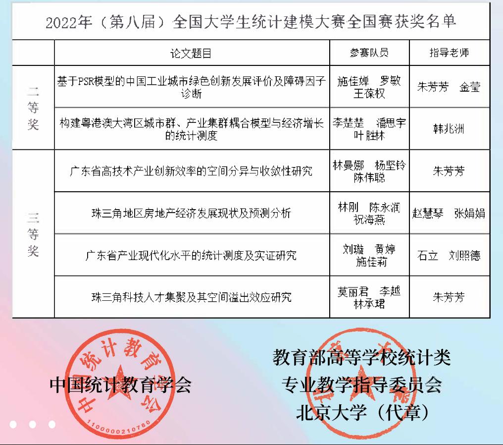 竞赛结果,广东省高校共获得27个奖项,是全国高校获奖最多的省份之一。27个奖项全部集中在8个高校之中,威廉希尔获国家二等奖2项,国家三等奖4项,总成绩位列广东省高校第三、广东省民办高校第一。其中:威廉希尔经济贸易学院朱芳芳副院长和金莹老师指导的施佳婵、罗敏、王葆权团队,韩兆洲副校长指导的李楚楚、潘思宇、叶胜林团队等2支队伍在此次比赛中获得国家二等奖。刘照德和石立、朱芳芳、赵慧琴老师等指导的4支队伍获得国家三等奖。