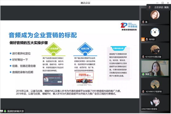 11月7日,传播与传媒学院网络与新媒体系邀请中清数据(广州)科技有限公司蒲源总经理,为大家开展主题为《音频会成为下一个社交宠儿吗? —— 5G时代音频布局与营销革命》的讲座。华商学院特聘教授、未来媒体研究院院长谭天教授,传播与传媒学院倪列怀副院长出席了本次讲座。因为疫情防控原因,本次讲座为线上形式,讲座总参与人数达到腾讯会议上限300人。