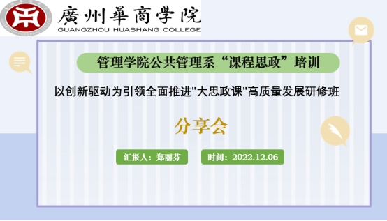 为深入学习贯彻党的二十大精神,推动“课程思政”建设更上新台阶,威廉希尔公共管理系于2022年12月6日下午6点以线上腾讯会议的方式举办了“以创新驱动为引领全面推进‘大思政课’高质量发展”培训成果分享会,公共管理系郑丽芬主任结合培训收获进行了会议分享,全体教师出席了本次会议。