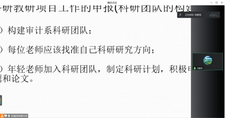 之后,为了助力审计系教科研人才的培养,刘善球副院长深入分析了青年教师在教科研方面面临的新机遇、新挑战,剖析了与一流课程、一流专业等建设目标相比,系部在人才队伍、学科建设、科研水平等诸多方面存在的差距,清晰地描绘了青年教师未来教科研工作的努力方向和工作任务,为审计系教科研项目和团队的发展加足了动力,指明了方向。