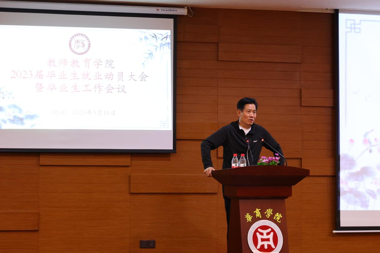 为深入贯彻党的二十大精神,积极落实“毕业生高质量就业”工作要求,充分调动毕业生就业积极性,进一步做好毕业生就业推进工作。2023年3月10日下午3时,教师教育学院以线上线下相结合的形式在图书馆报告厅召开2023届毕业生就业动员大会暨毕业生工作会议。出席本次会议的领导嘉宾分别有:教师教育学院王金道院长、教师教育学院谭建生副院长、教师教育学院学工办许娜主任、朱娜老师、就业指导中心贺艺成老师,本次会议由学工办许娜主任主持。