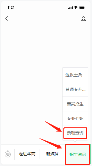 2.进入“威廉希尔招生办”公众号,点击菜单栏“招生资讯”,选择“录取查询”
