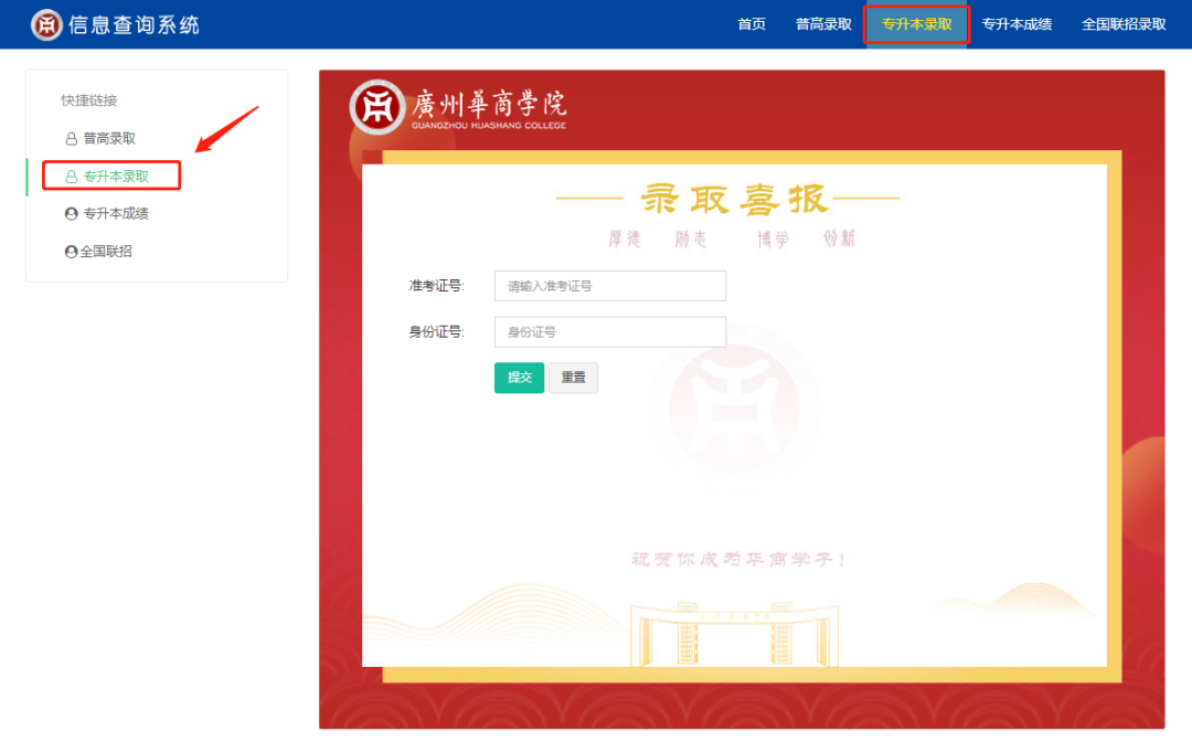 2.进入录取查询系统后选择“专升本录取”,输入“准考证号”和“身份证号”点击“提交”即可查询录取结果