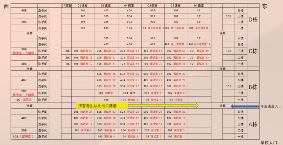 注意:先储物,只允许带身份证、准考证、水杯,其他物品存放在储物室,面试后凭号码牌取物。再抽签,沿地面的脚印贴纸到抽签室。