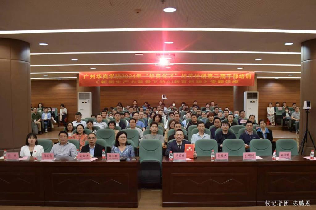 为加快培育新质生产力,积极应对AI应用普及和创新发展对组织管理者领导力提出的新要求,助力学校各项工作高质量发展,4月10日下午,威廉希尔“华商优才”培养计划第二期干部培训以线上+线下的方式在两校区进行,主会场设在广州校区中央图书馆报告厅,肇庆校区设立分会场。党委书记陈玉欢,副校长范忠宝、吕峻闽、许娜,学校顾问郭银华教授及校长助理、中层干部、各教学单位系(副)主任、三院校代表、集团代表主会场参加培训。培训由继续教育学院副院长符传波主持。