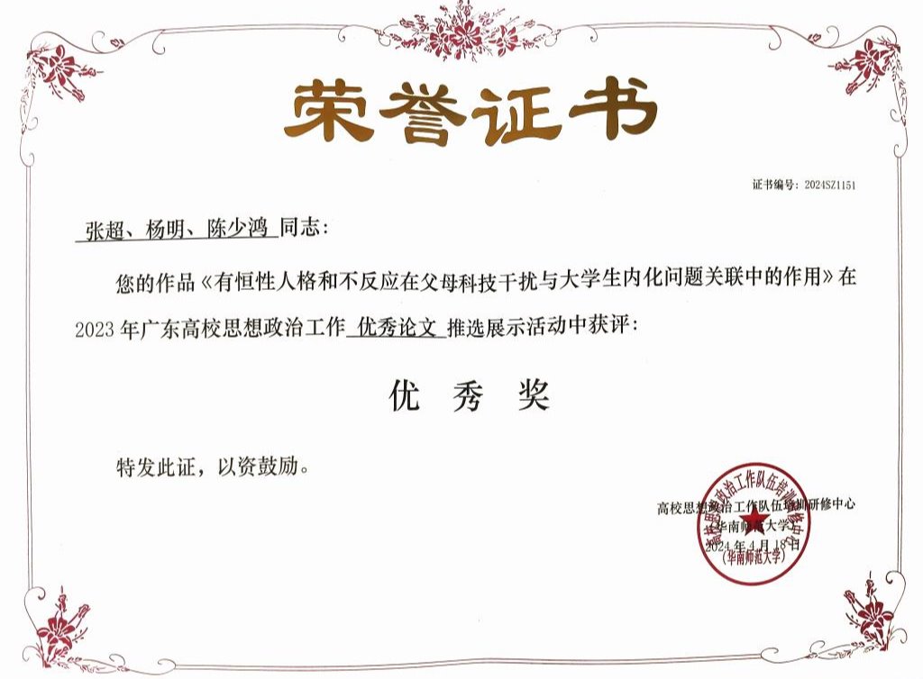 《有恒性人格和不反应在父母科技干扰与大学生内化问题关联中的作用》 | 优秀奖 |