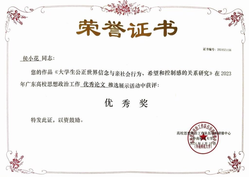 《大学生公正世界信念与亲社会行为、希望和控制感的关系》 | 优秀奖 |